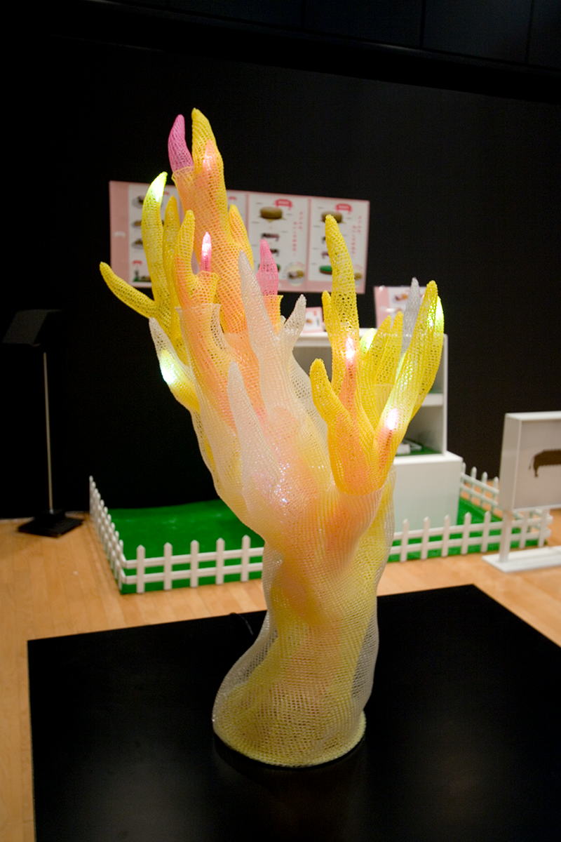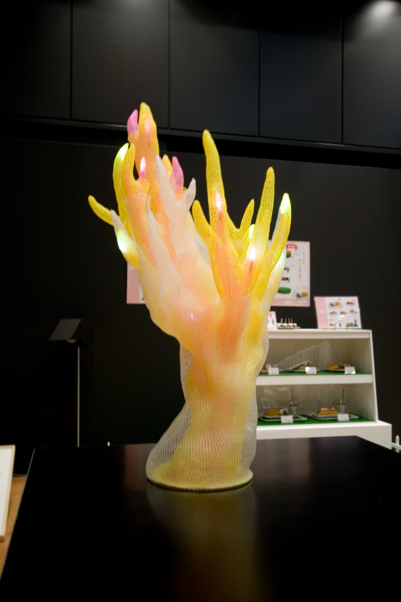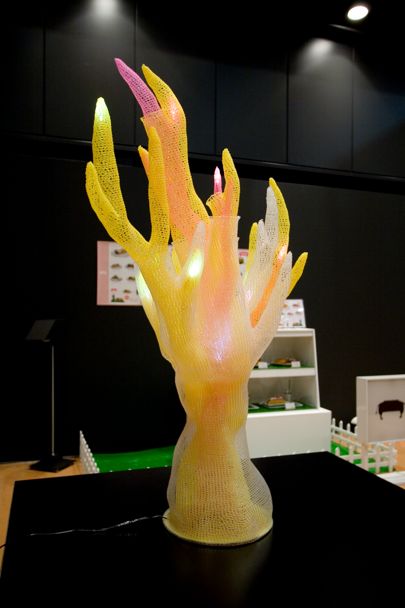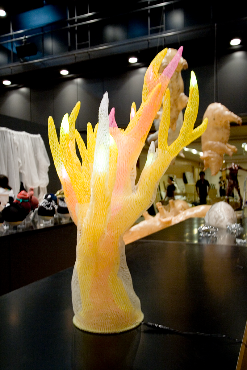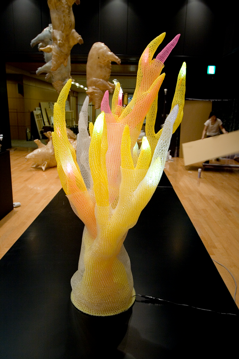 作品 上に向かって伸びる物体(モノ) 作品名:上に向かって伸びる物体(モノ) サイズ:W=600mm D=600mm H=900mm 素材:ナイロンテグス / 光源:LED 2005年9月 東京コンペ#2 入選