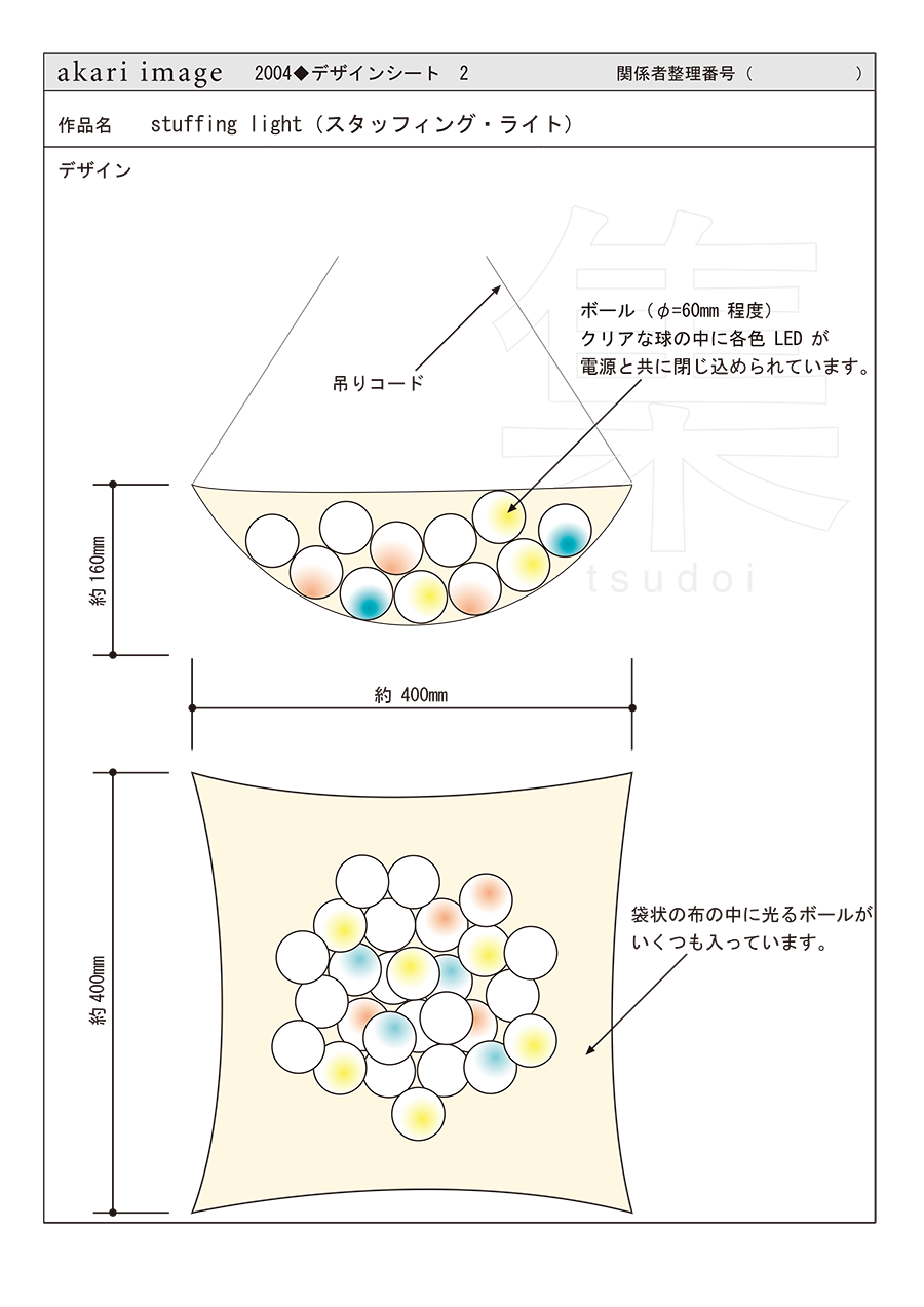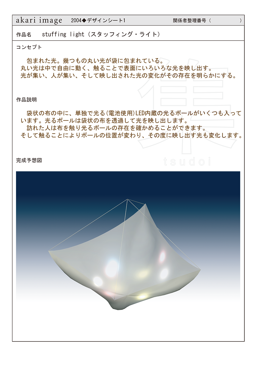 作品 stuffing light 作品名:stuffing light サイズ:W=400mm D=400mm H=160mm 素材:布・プラスチック 光源:LED 2004年11月 akari image 2004 入選 デザインシート